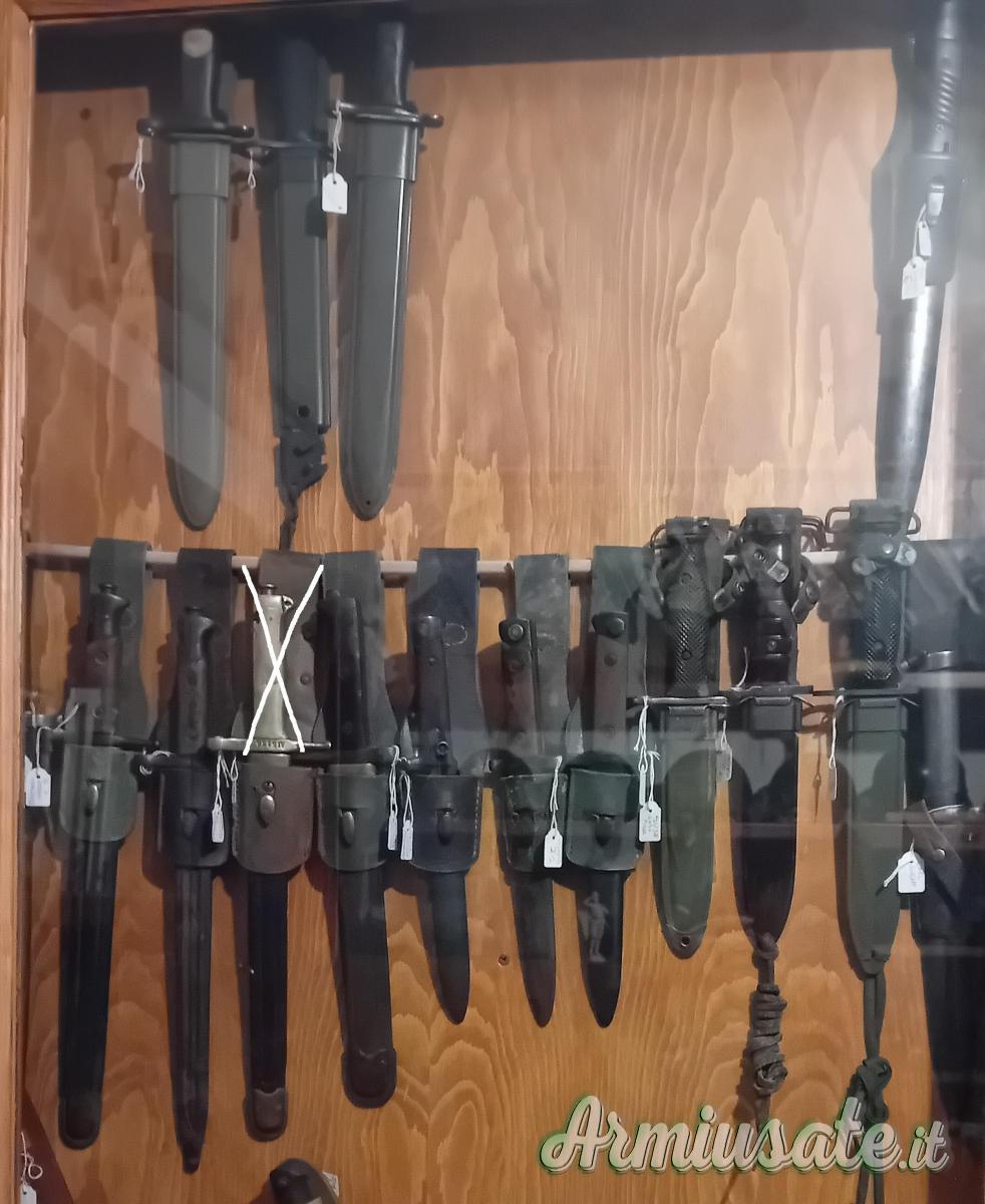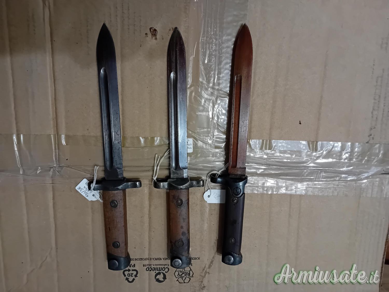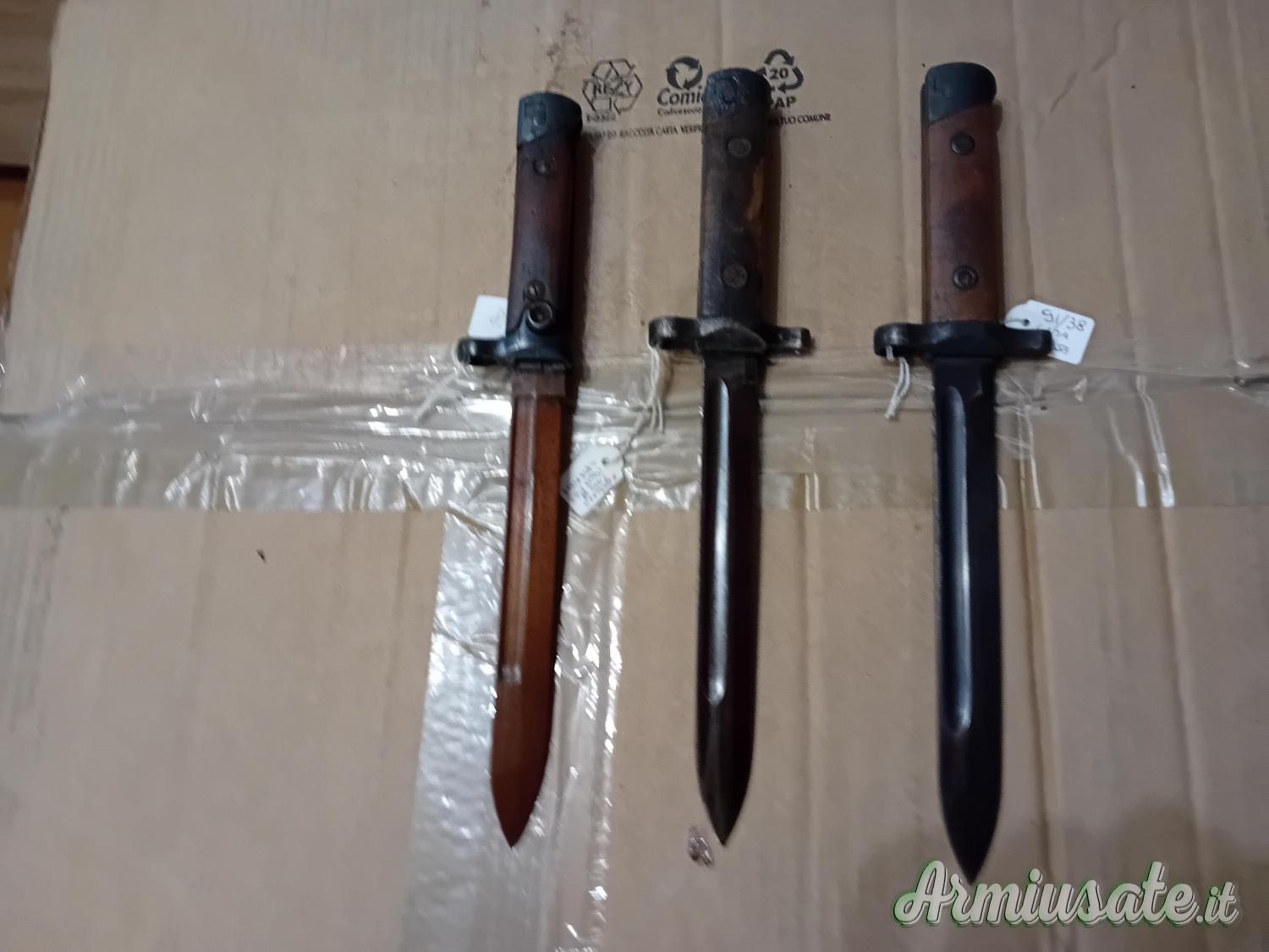 Ne ho diverse per Lee Enfield e modificate Terni per fucile mod. 91. Chiedo, prima della visione, esibizione della licenza utile alla detenzione. Sono ripetitivo: le baionette sono tutte denunciate e cedibili con atto da depositare negli uffici di polizia/carabinieri per l'inserimento in denuncia. A solo titolo d'esempio baionette per k98 da 80€ a 250€ a seconda del tipo, condizione e matricola: ne ho alcune in condizioni da museo. Prego astenersi da offerte oltraggiose, sono collezionista, conosco il valore di quello che possiedo e, per fortuna, non sono in fin di vita. Per la '91 TS posso valutare offerte serie, astenersi finti ignari del tipo di baionetta, o che fanno giri di discorsi per poi, dopo svariate trattative inconcludenti, offrire una cifra irrisoria: il valore della TS supera i mille euro, grazie alle specifiche, documentabili. Non sono preso dalla disperazione e quindi non ho nessuna fretta di vendere.