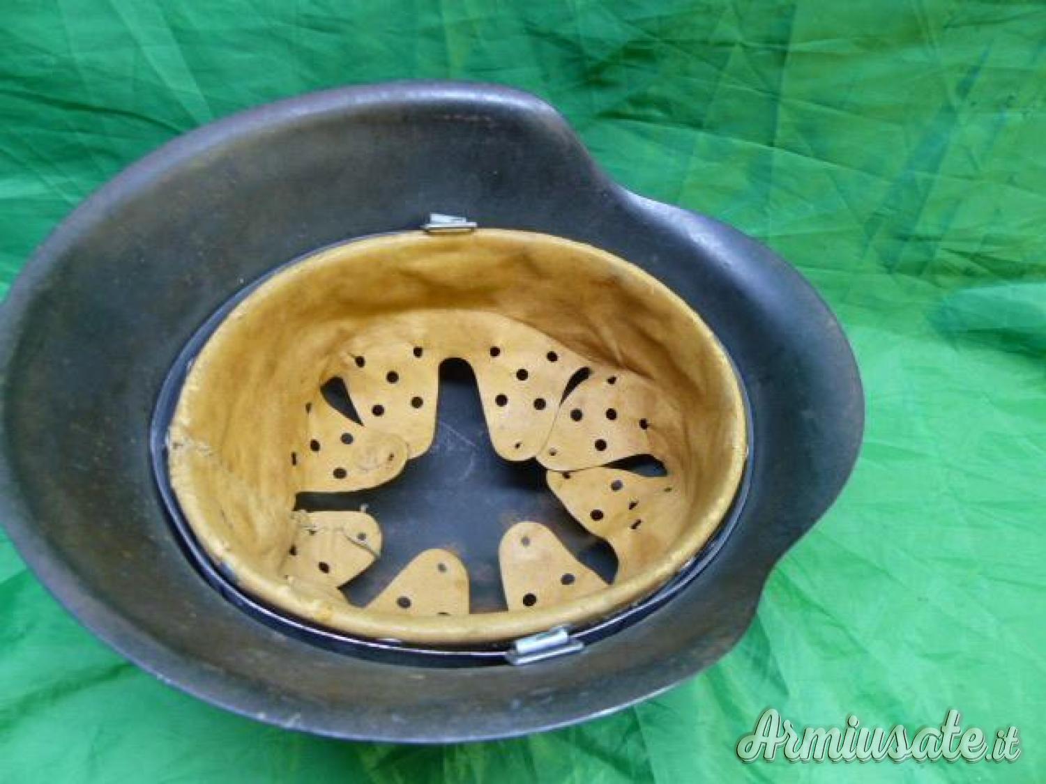 Elmetto tedesco in buone condizioni, conserva la totalità della colorazione originale eccetto qualche piccolissime mancanze o striature da uso. La cuffia in pelle è in ottime condizioni , morbida e flessibile,. All'interno si nota un timbro (come si vede in foto), la taglia 50 e un numero di serie sulla falda sinistra. Originale e intonso. Manca il soggolo. L'ELMETTO NON E' STATO RIMONTATO MA IN CONDIZIONI D'ORIGINE.