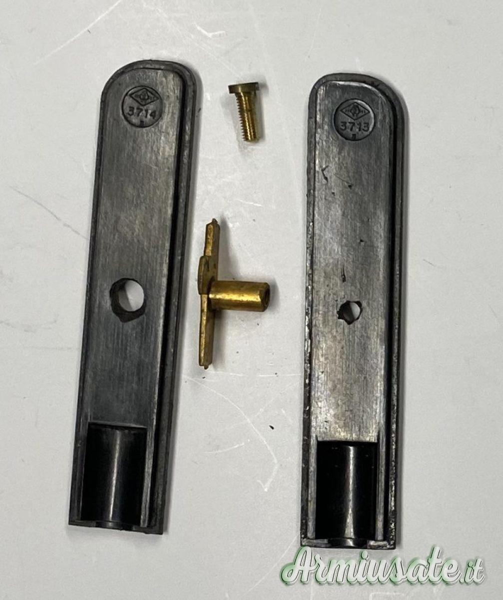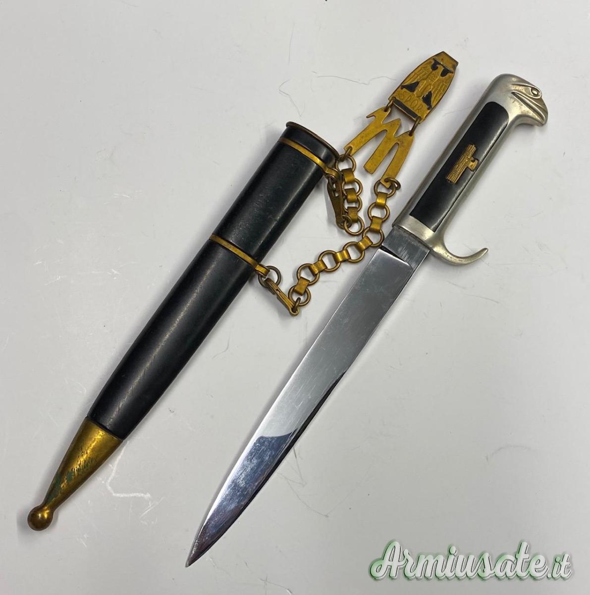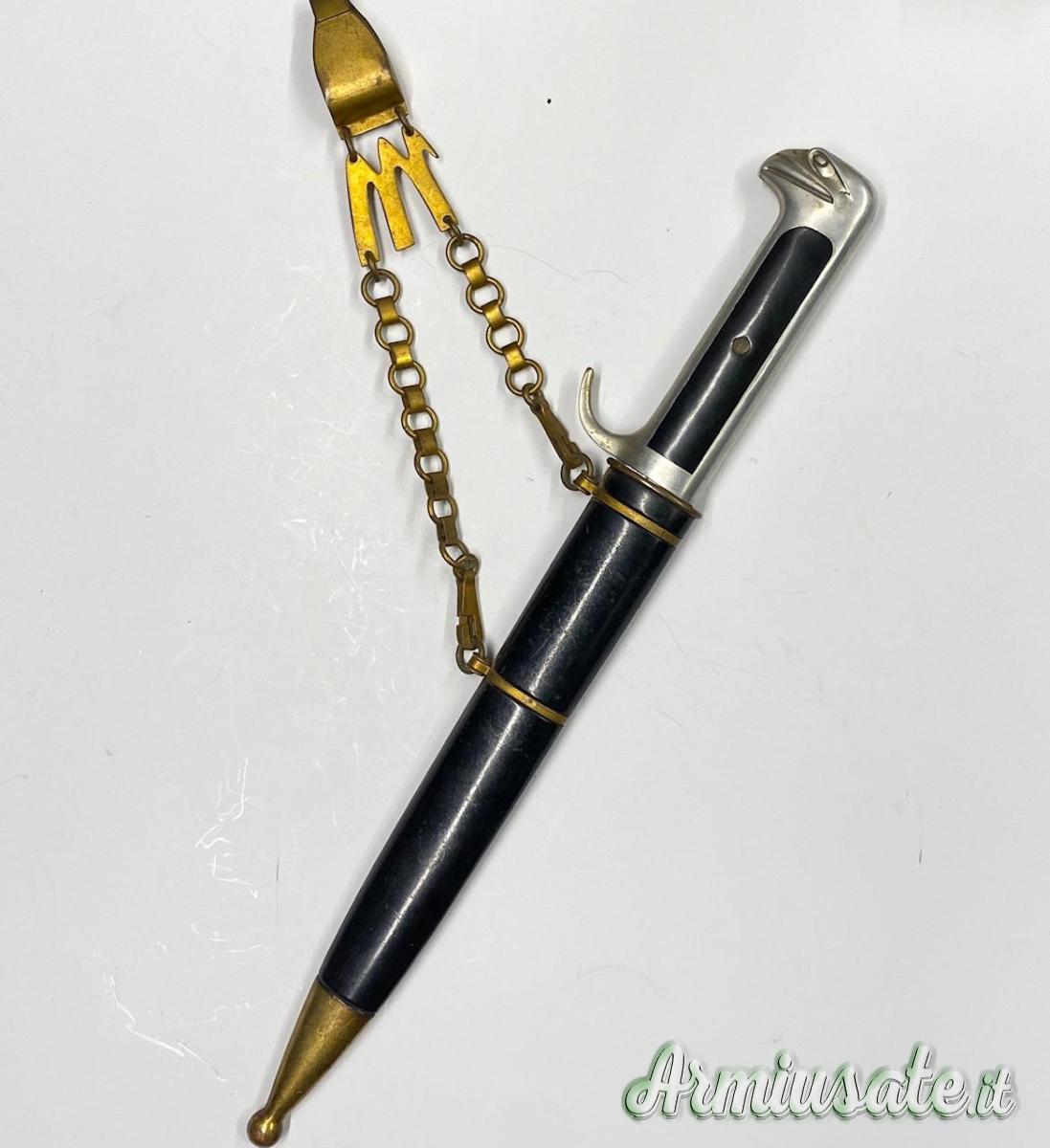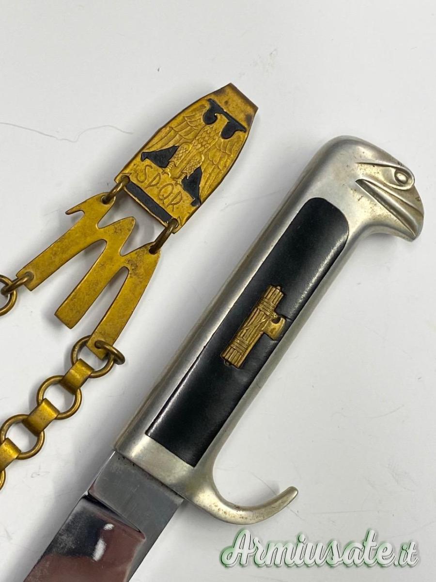Impugnatura in alluminio a forma di testa d’aquila e guancette in bakelite originali marcate all’interno, trattenute dal fascio littorio dorato con vite. Fodero metallico con anelli e puntale dorati, completo delle sue sospensioni a catenella in metallo dorato con moschettone di aggancio riportante l’aquila imperiale sull’acronimo S.P.Q.R. e sotto la M mussoliniana.