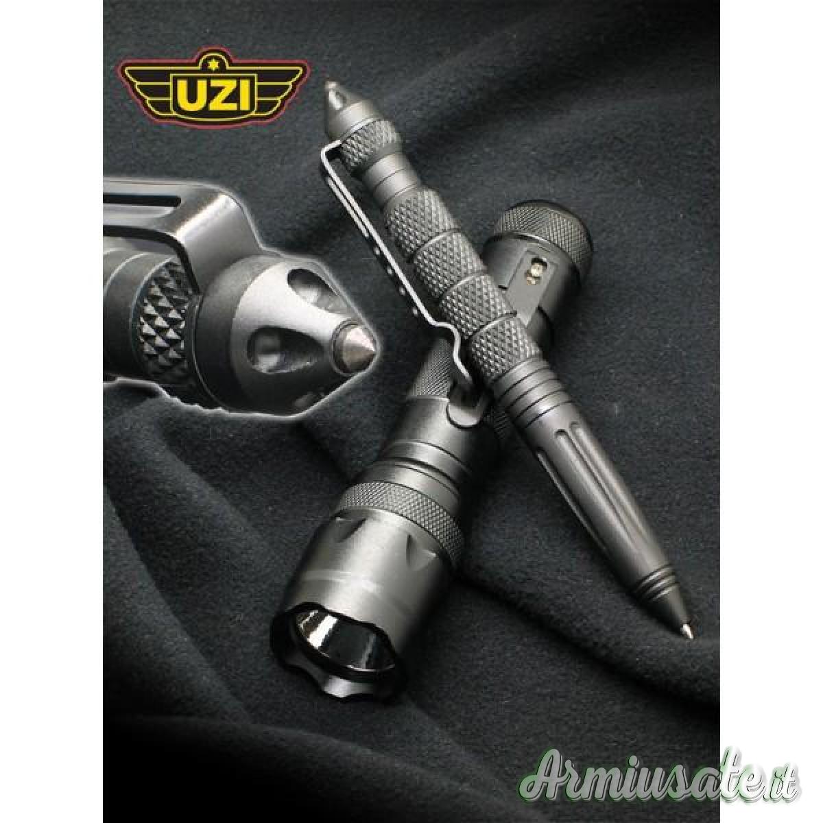 - Penna tattica costruita completamente in alluminio aeronautico, funziona come penna normale con refil sostituibile e presenta puntale spaccavetro all'estremità opposta. Con clip da taschino e logo 'UZI'. Lunghezza totale 15 cm.