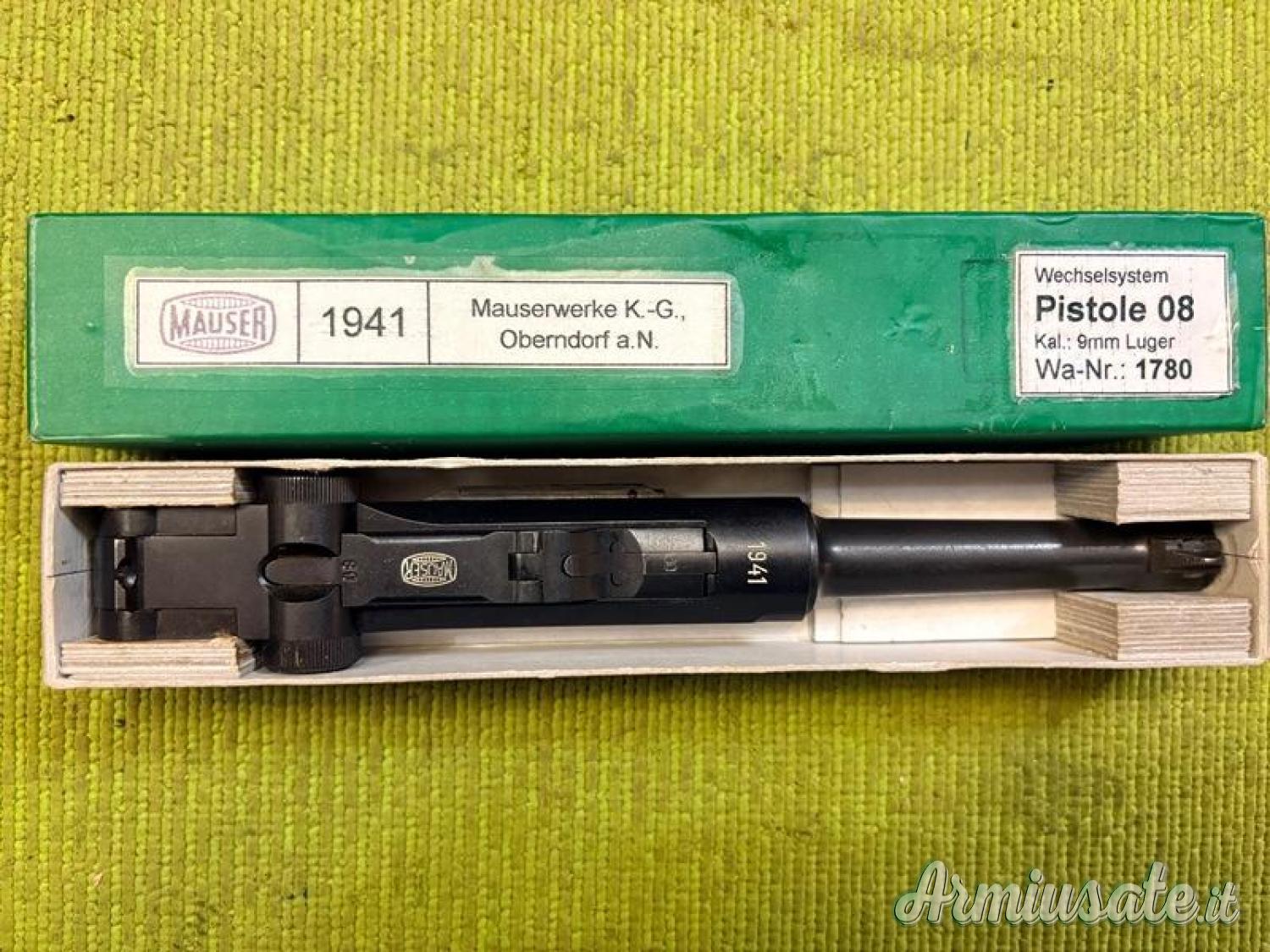 Conversione canna + carrello per pistola Mauser Luger P08 prodotta nel 1941 per la Polizei del terzo Reich. Ottime condizioni. Calibro originale mm 9x19 (9 Luger). Classificata parte d'arma.