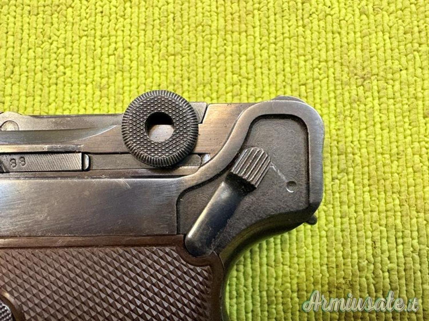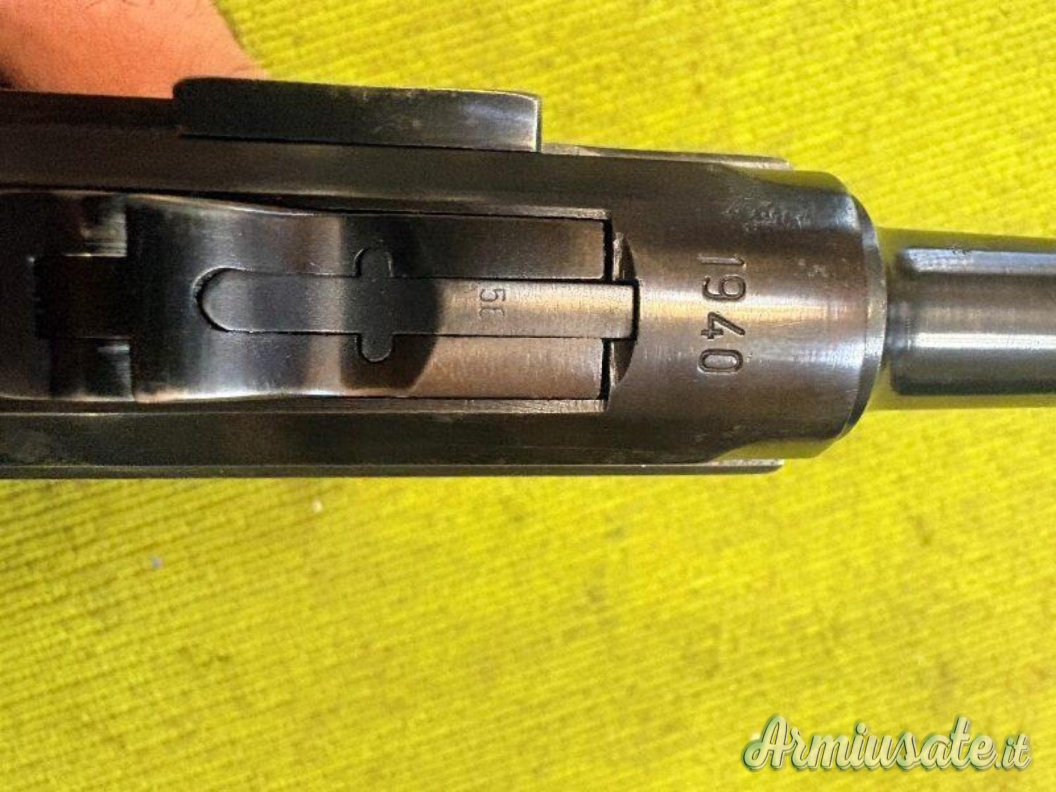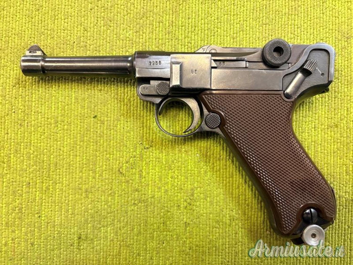 Luger P08 prodotta dalla Mauser (42) nel 1940. Ottime condizioni, canna a specchio, arma interamente monomatricola. Guancette in bachelite marrone (Krieghoff). Calibro mm 9×19 (9 Luger). Arma classificata sportiva.