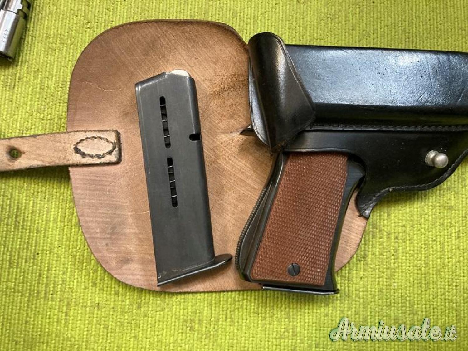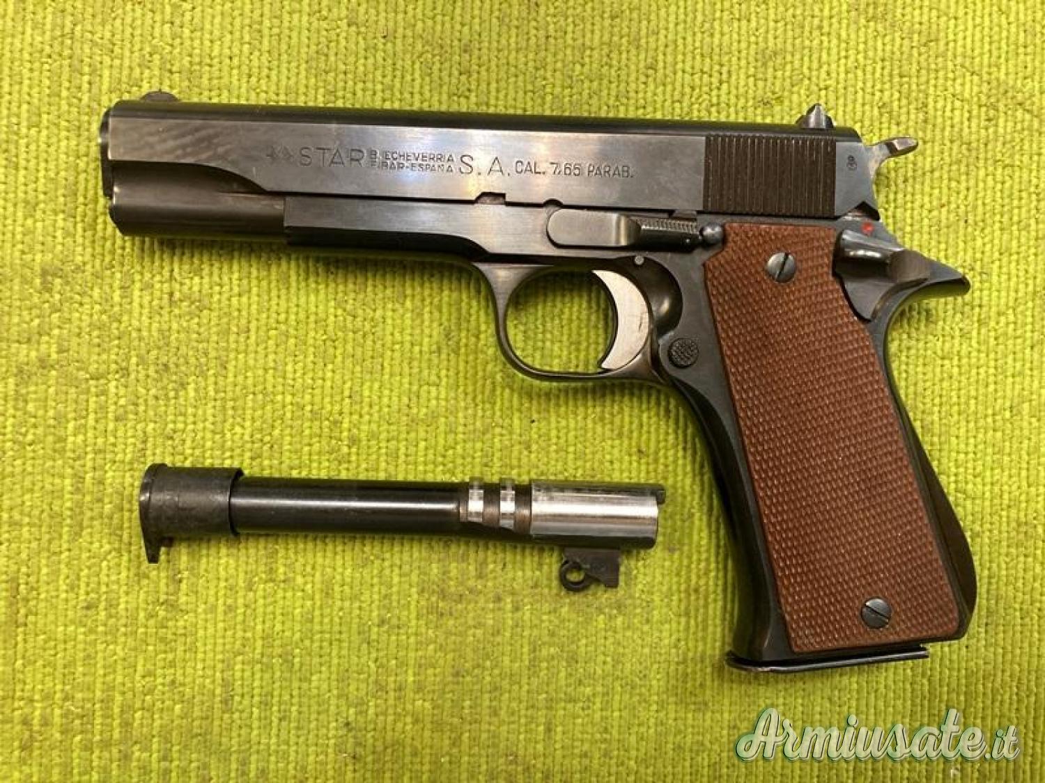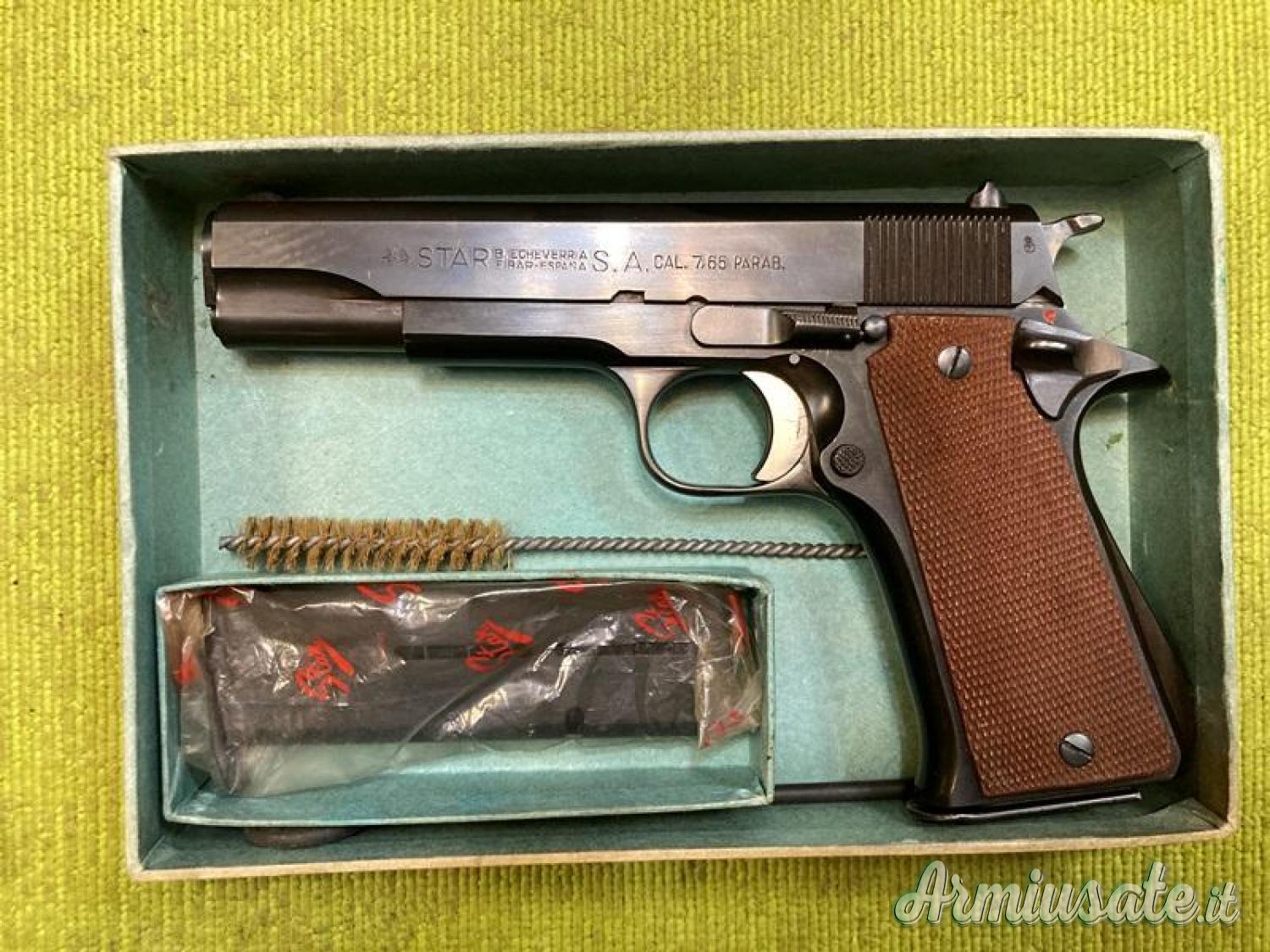 Pistola Star mod. US in calibro mm 7,65 Parabellum con canna di ricambio Star (stessa matricola dell'arma) in calibro mm 9x19 (9 Luger). Ottime condizioni, scatola, manuale, attrezzi per pulizia e fondina in cuoio nero con terzo serbatoio.