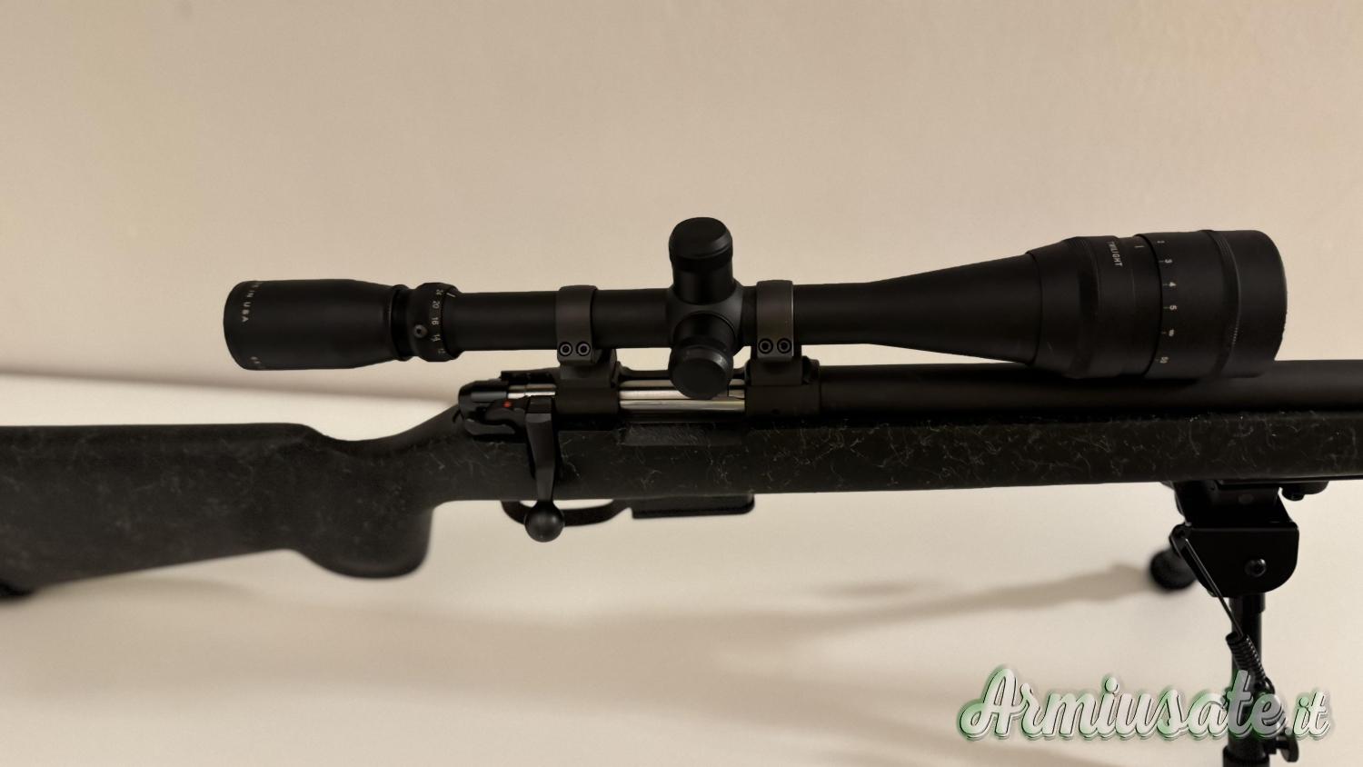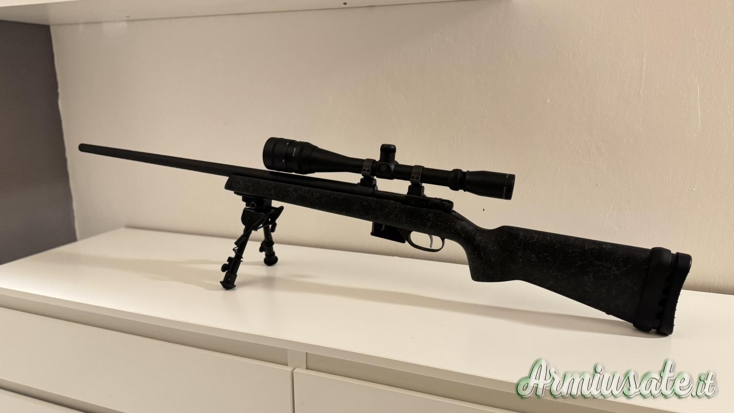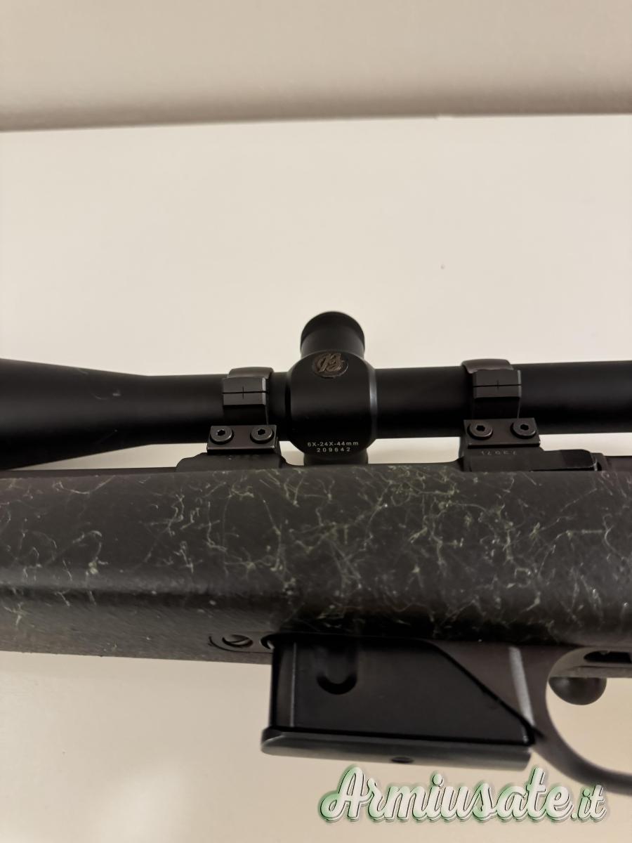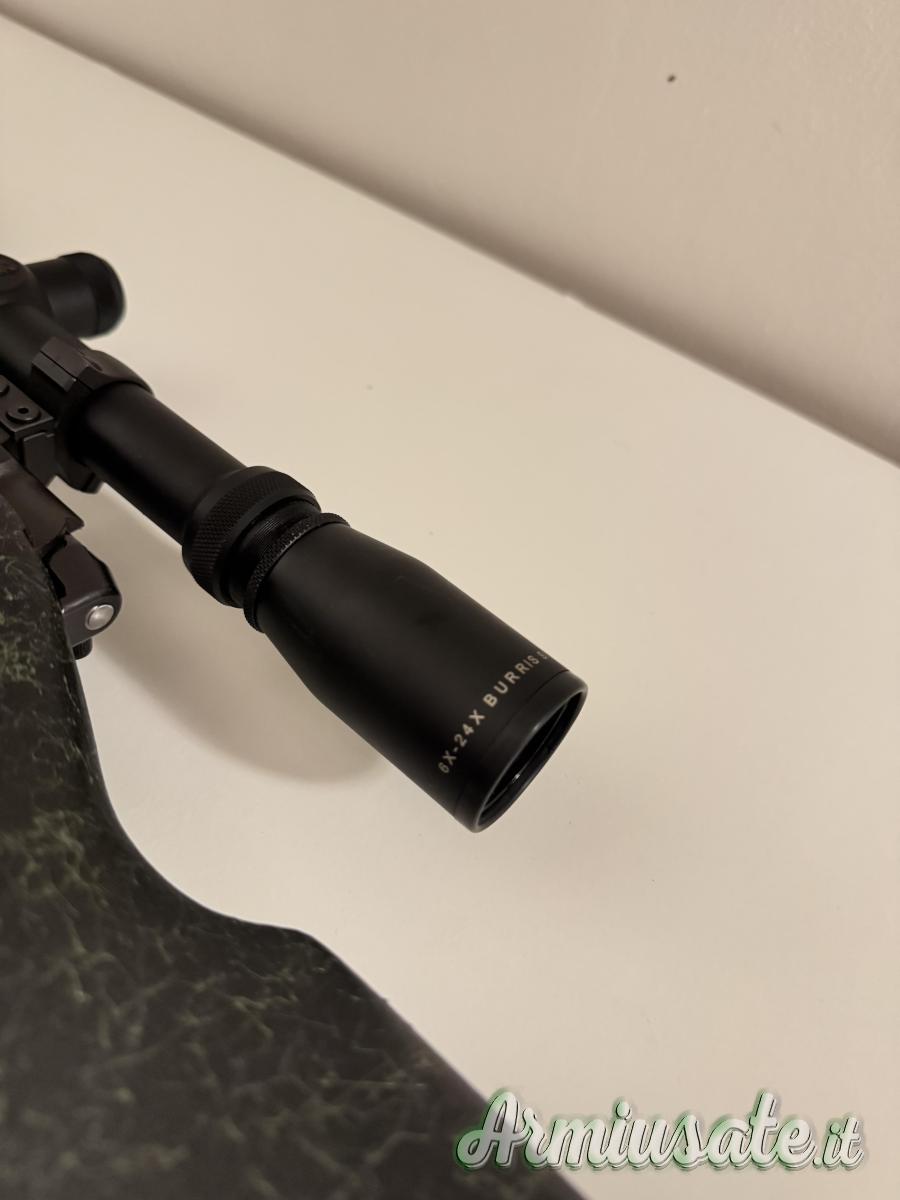 Calciatura in sintetico con calciolo prolungato ammortizzato, compreso di ottica burris 6x-24x, compreso anche di bipiede. La carabina è veramente ben tenuta e precisa.
