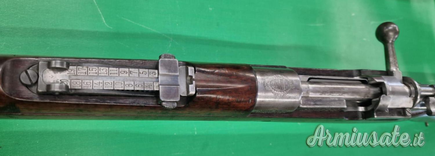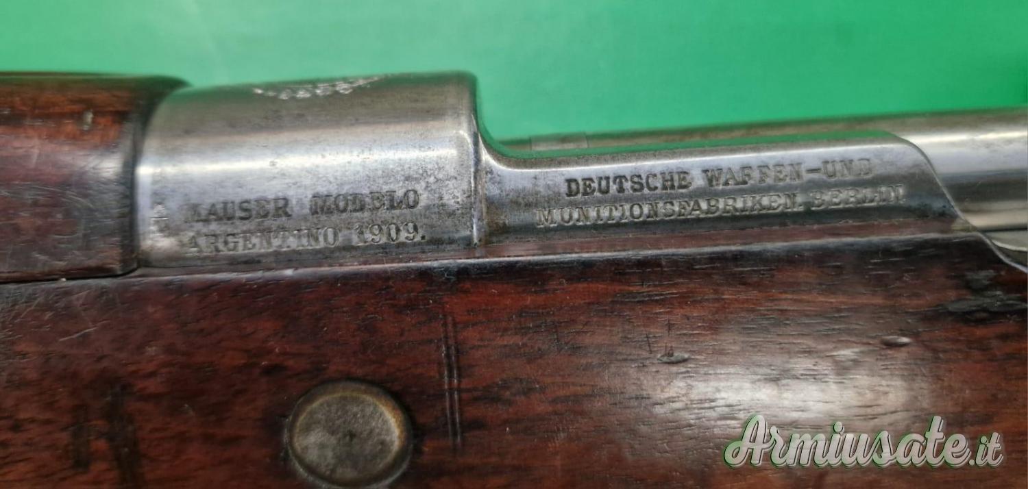 Prodotto dalla Deutsche Waffen und Munitionsfrabiken di Berlino su contratto specifico per l’Argentina. Modello “Mauser Modelo Argentino 1909” come riporta la rullata sul lato sinistro della culatta. Molto simile al Mauser Gew 1898 presenta l’emblema della Repubblica Argentina sul manicotto di camera. Il monogramma degli ispettori e il punzone “berretto tipo frigio” sono applicati sulle principali componenti. Arma monomatricola.