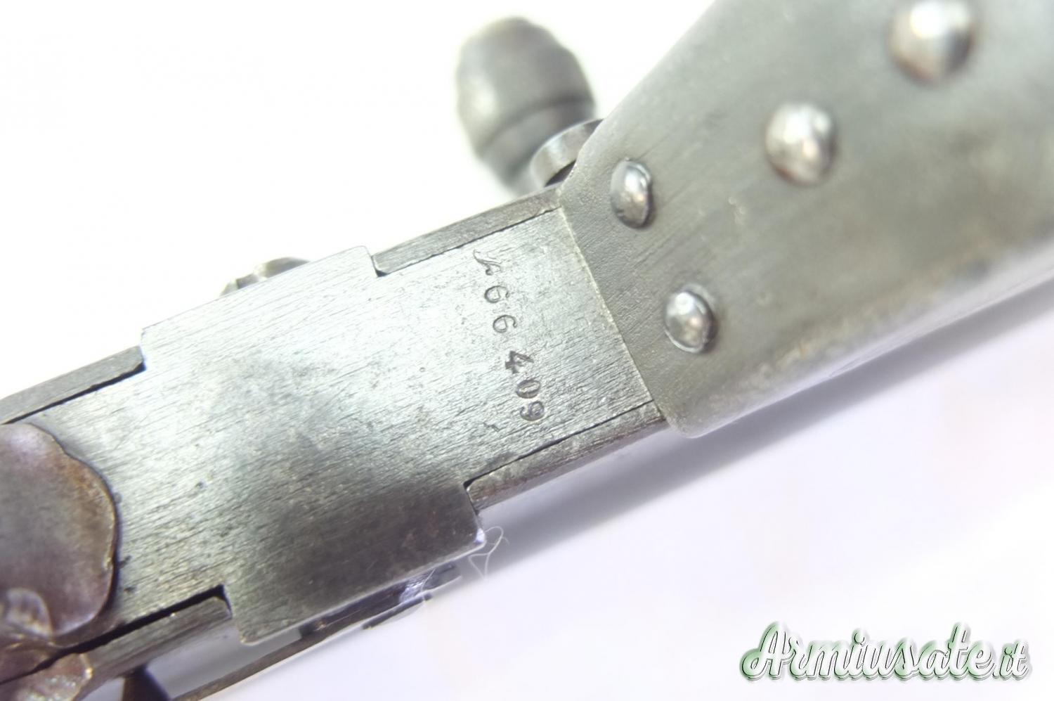 QUESTO ESEMPLARE OLTRE AD ESSERE ANCORA MONOMATRICOLARE RIPORTA SUL LATO SX I DANNI PROVOCATI DALLA BOMBA “SHRAPNEL” SI VEDONO DUE STRISCIATE DI PALLINI FUORIUSCITI DALL’ESPLOSIONE DELLA BOMBA.UNO IN PROSSIMITA’ DELLA TACCA DI MIRA E L’ALTROSUL PONTICELLO DEL GRILLETTO.
