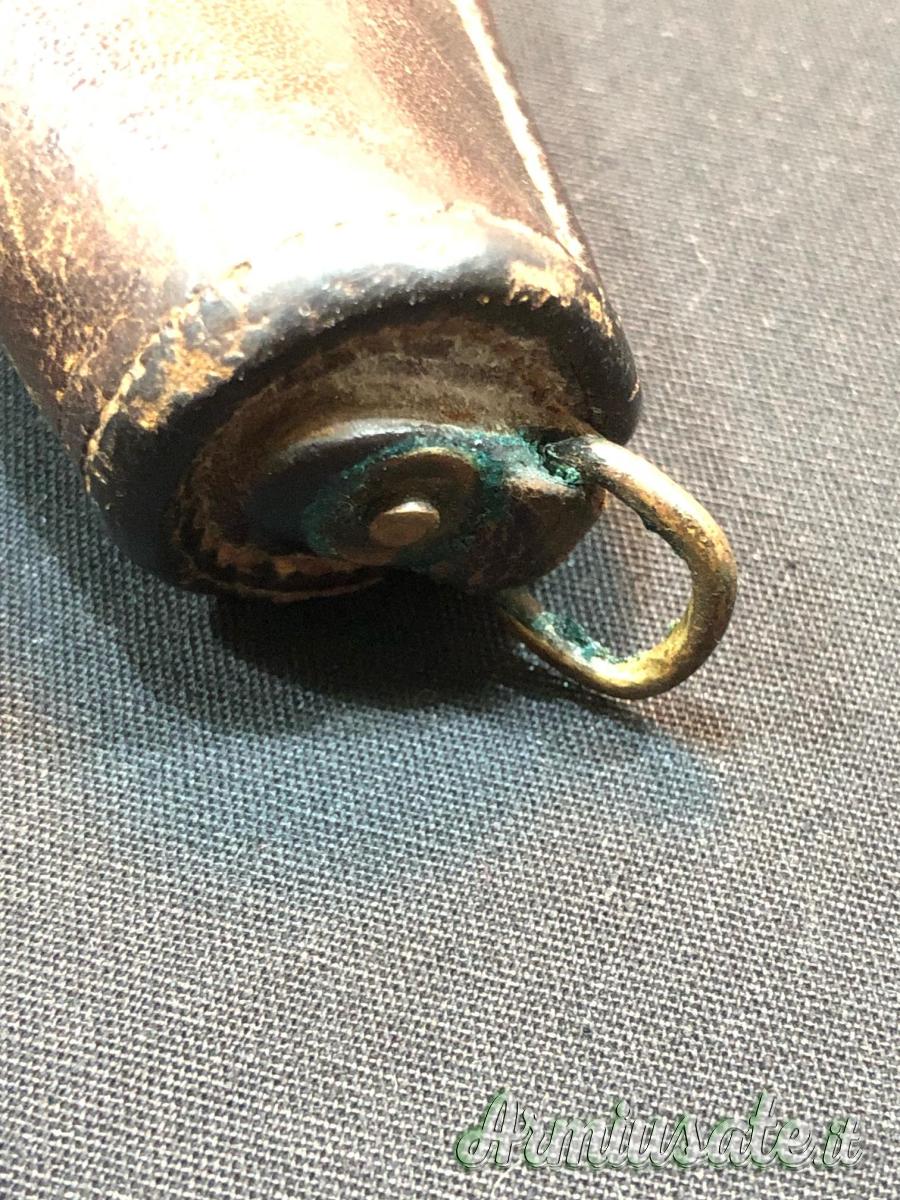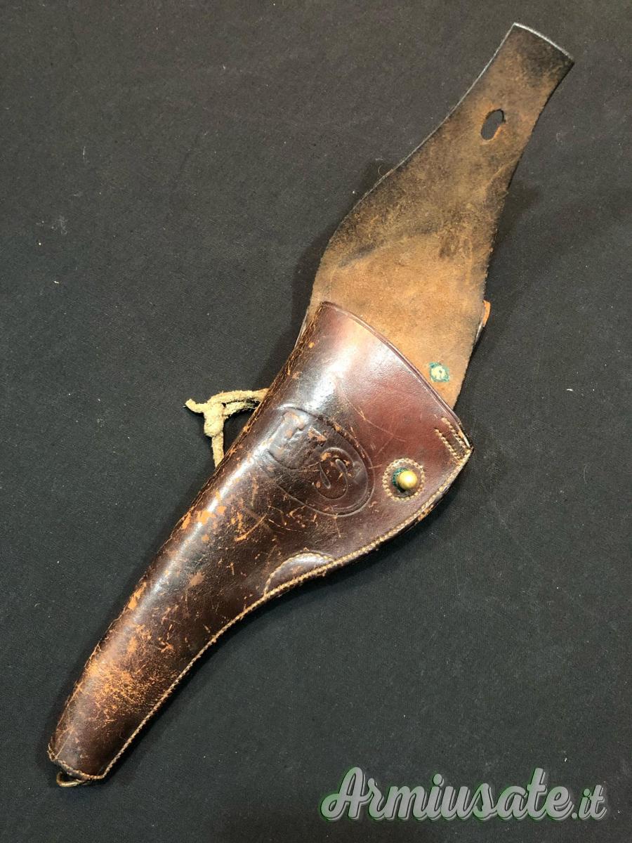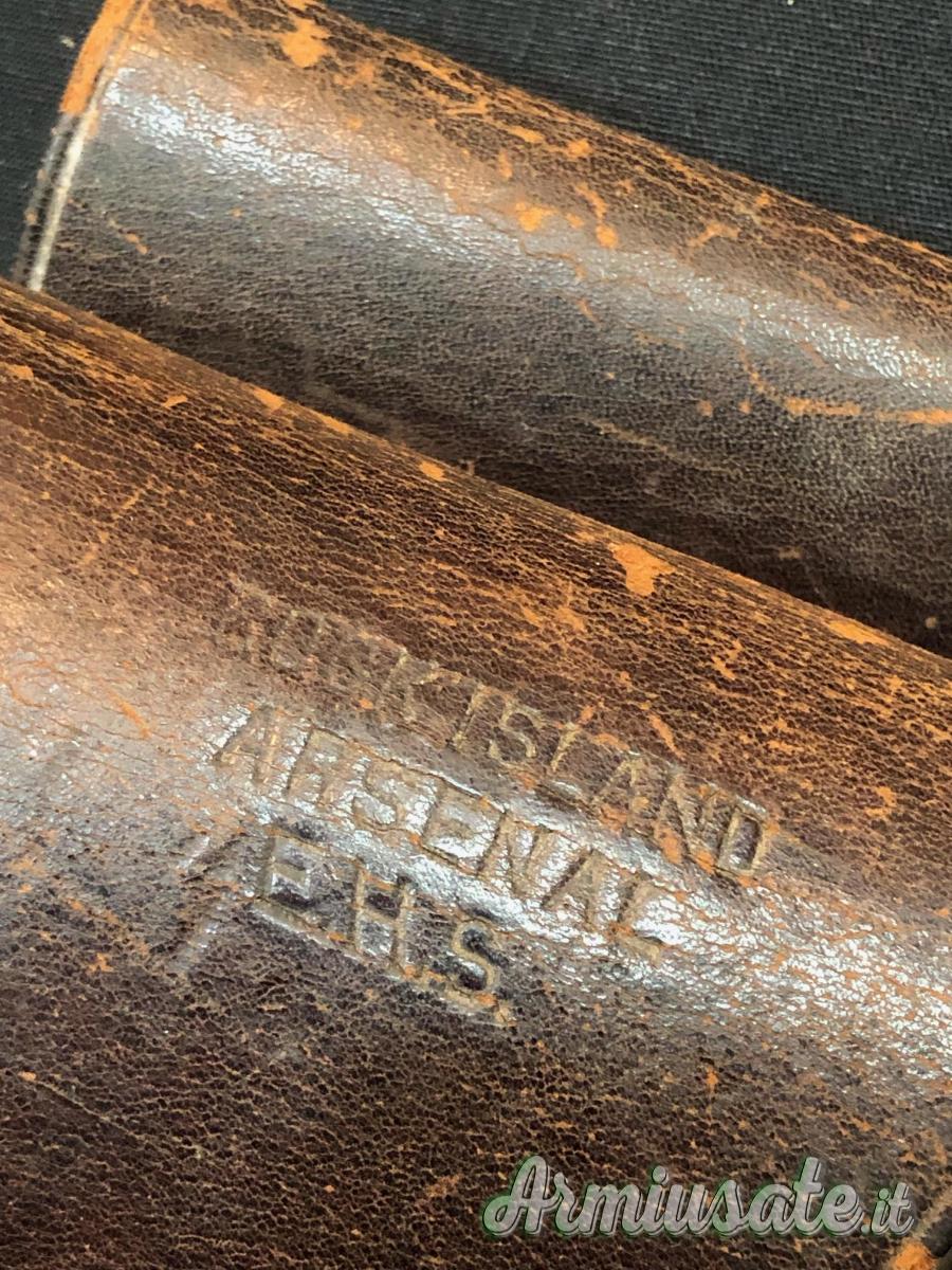 Un ottimo esemplare, questa fondina è sopravvissuta in condizioni di tutto rispetto, con cuciture solide, tutte le cuciture intatte e tutti i componenti, inclusi il tappo e l'anello di fissaggio , sono presenti. Il corpo è solido e pieno, senza punti deboli. La scritta "US" in rilievo nell'ovale sulla parte anteriore del corpo della fondina è molto leggibile. Il timbro del produttore "Rock Island Arsenal" e le iniziali dell'ispettore "EHS" sulla patta sono ancora ben leggibili. La superficie in pelle sul corpo e sulla patta è nel complesso molto liscia e lucida con screpolature minime.