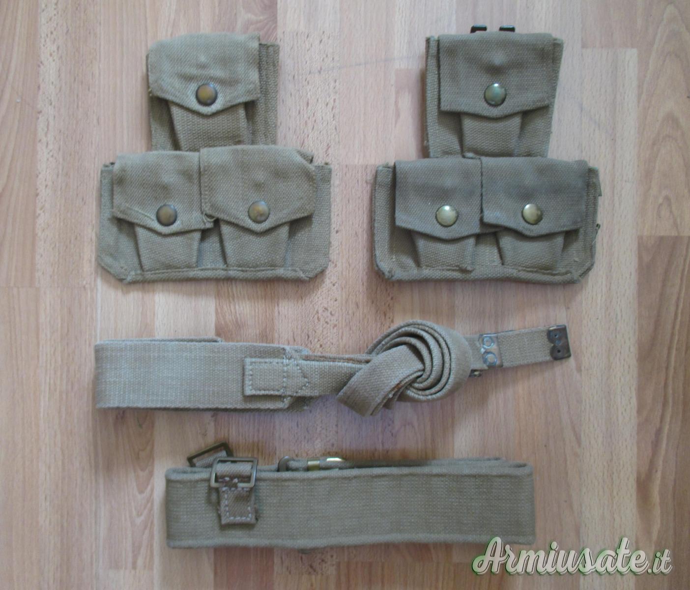 - Buffetteria in canapa ocra e fornimenti in ottone, nella versione "di base" (cinturone, spallacci e giberne). Le giberne hanno la tipica forma a 3 tasche, ognuna delle quali può contenere 1 lastrina di caricamento per Garand M1. Si noti, a tale proposito, come la presenza di 2 bottoni automatici per la chiusura delle pattine dipenda dal tipo di munizioni - 30.06 USA o 7.62 NATO - inserite nelle lastrine.