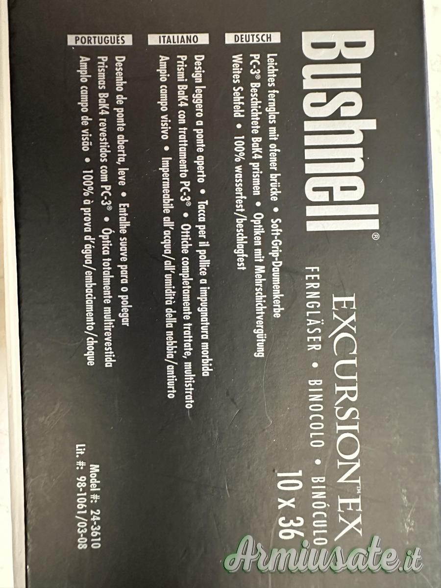 Vendo binocolo Bushnell modello Excursion EX 10x36 , condizioni pari al nuovo, a corredo confezione originale, istruzioni, custodia rigida con tracolla, pezza per pulizia lenti, tracolla imbottita per binocolo, custodia in tessuto per binocolo, tappi proteggi lenti, binocolo. Le lenti sono perfette. Molto versatile grazie a peso e dimensioni ridotte.