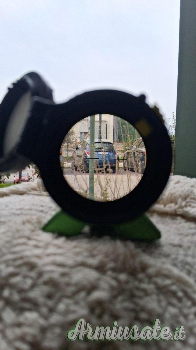 Eye Relief molto alto pari a 3,7" che velocizza l'acquisizione del bersaglio e non presenta problemi di parallasse o di messa a fuoco alle alte velocità.
