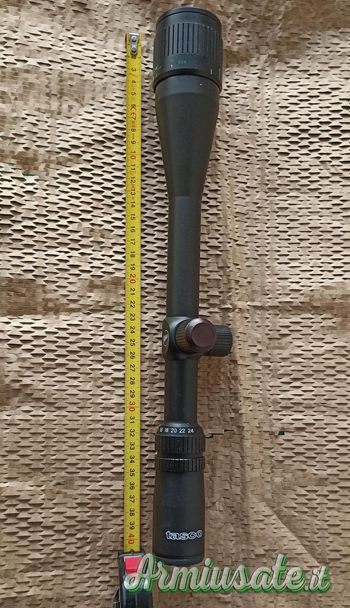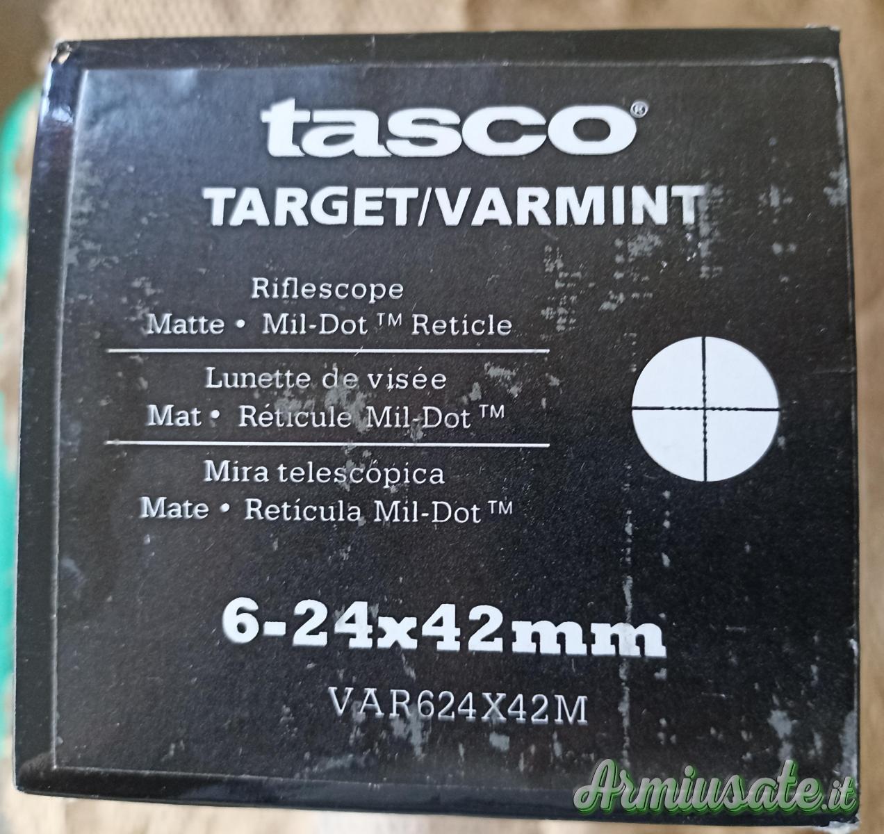 Si tratta del TASCO 6-24x50 TARGET o VARMINT, ancora NUOVO in scatola. Ha un reticolo tipo Mil-Dot ma abbastanza sottile per i buchi piccoli fatti sui bersagli del poligono. Il tubo è da 30 mm.