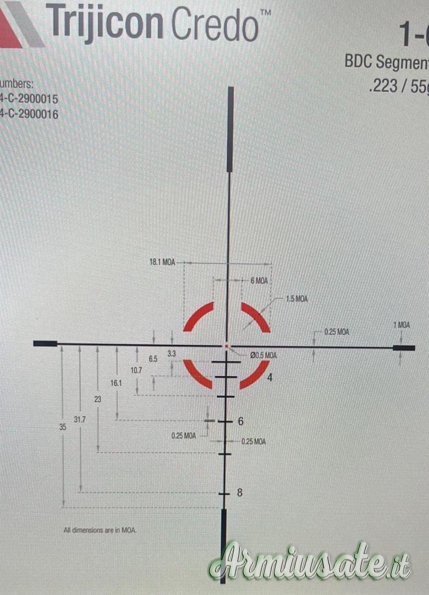 Condizioni perfette , ottica studiata per il calibro 223 Remington con reticolo facile e molto intuitivo specie su carabine AR15. Completo di scatola originale .