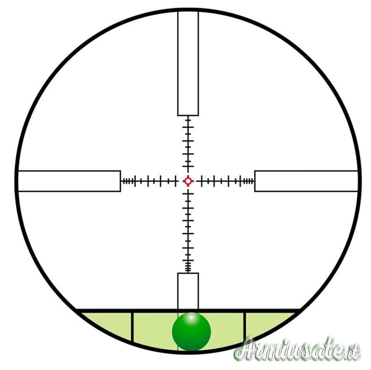 Eccellente scelta per tiro a lunga distanza, il reticolo inciso è sul 1° piano focale quindi i riferimenti restano validi a qualunque ingrandimento.