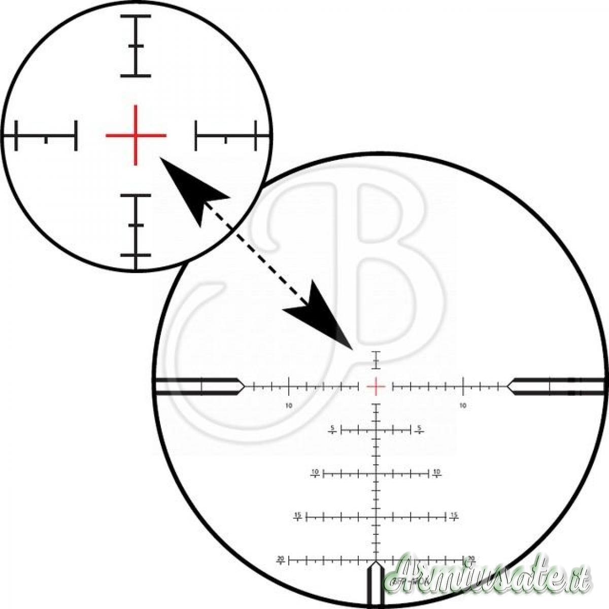 Questo reticolo è stato sviluppato principalmente per la caccia in terreno aperto e su lunghe distanze. I mirini a forma di albero sono progettati in modo intuitivo e offrono un punto di mira estremamente preciso. I segni di graduazione e i punti hanno una distanza di un minuto di angolo (1 MOA) al rispettivo ingrandimento di riferimento e forniscono sempre un punto di riferimento adeguato, anche in condizioni di vento. L'app ZEISS Hunting può essere utilizzata per determinare in modo rapido e preciso sia la caduta del proiettile che la deriva del vento praticamente per qualsiasi munizione e inoltre visualizza i valori della distanza in una rappresentazione visiva del reticolo. Solo l'area centrale del reticolo è illuminata, per un puntamento preciso anche in condizioni di scarsa illuminazione.