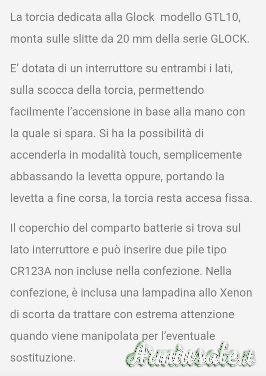 Torcia dedicata alla Glock modello GTL10, monta sulle slitte da 20mm della serie Glock . Comprese 2 batterie del valore di euro 15,00.