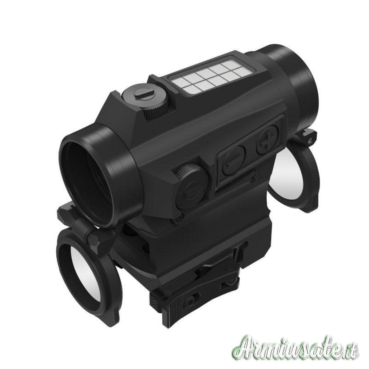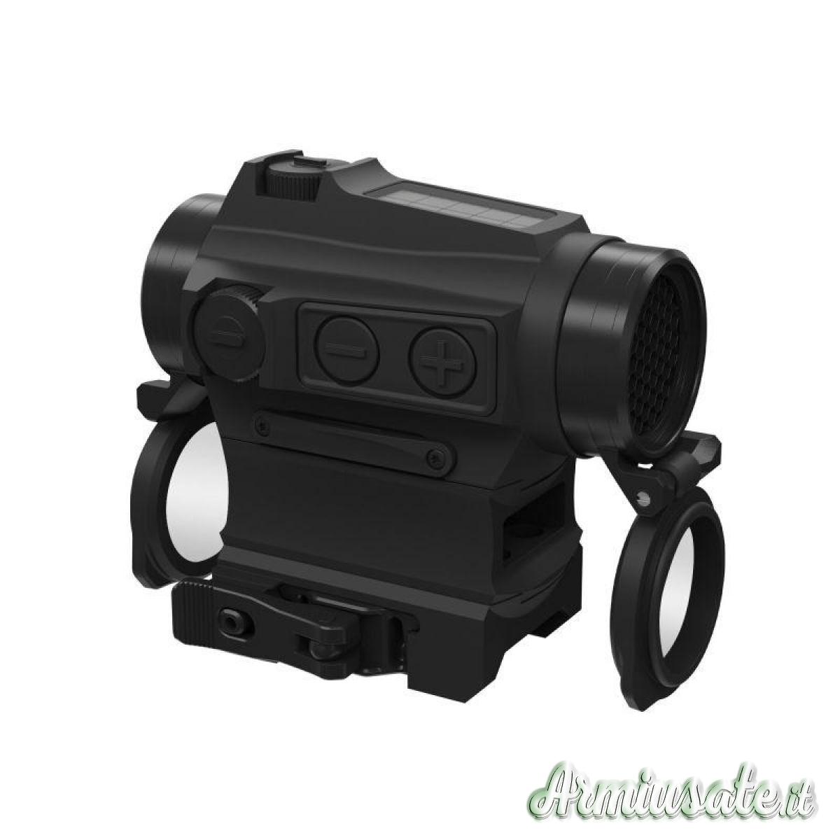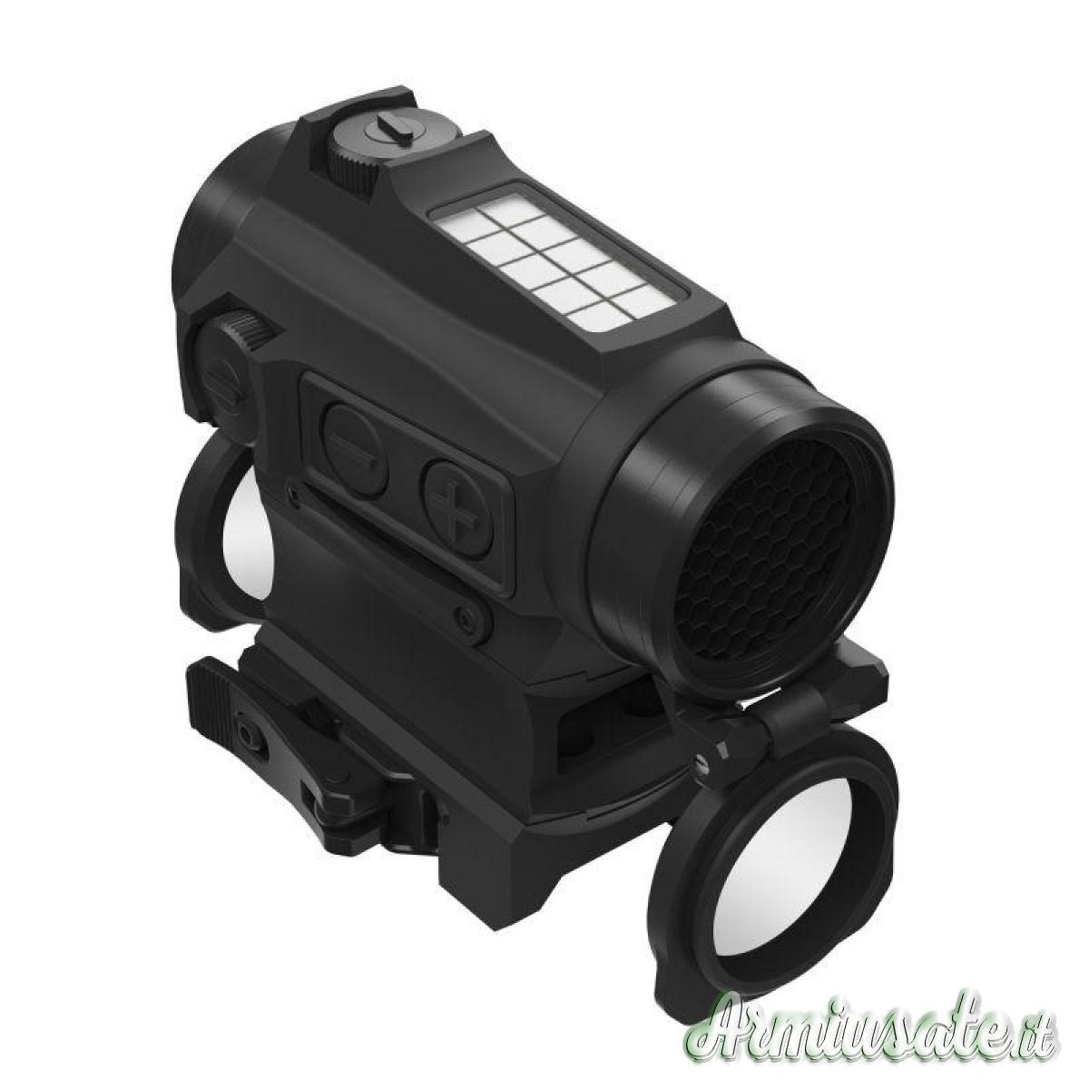 Punto rosso top di gamma della gamma micro red dot di Holosun. Taratura stabile e precisa di 0,5 MOA/click, impermeabile IP67, esente da parallasse, 12 livelli di luminosità per qualsiasi condizione ambientale, punto di mira occultato, pulsanti + e – per facilitare le fasi di impostazione dell’ottica senza ostruzione della visione, doppia scelta per la selezione del reticolo a LED tra red dot 2MOA e red dot + circle dot 65MOA. Filtro a nido d’ape anti-abbaglio e attacco a sgancio rapido per slitte Picatinny/Weaver, struttura caratterizzata dalla posizione delle torrette balistiche incastonate su due lati nel corpo dell’ottica a garanzia di una maggiore sicurezza contro eventuali urti e spostamenti accidentali della taratura. Memorizza l’ultimo livello di luminosità utilizzato che viene automaticamente re-impostato alla riaccensione, funzione di auto-spegnimento, sensore di movimento che gli permette di riattivarsi dallo “sleep-mode” ad ogni movimento dell’ottica, pannello solare per alimentarsi anche senza l’ausilio delle batterie. Imposta automaticamente la luminosità del red dot in base alla quantità di luce presente nell’ambiente, con una breve pressione del tasto + torna al funzionamento a batteria e alla regolazione manuale della intensità del red dot.