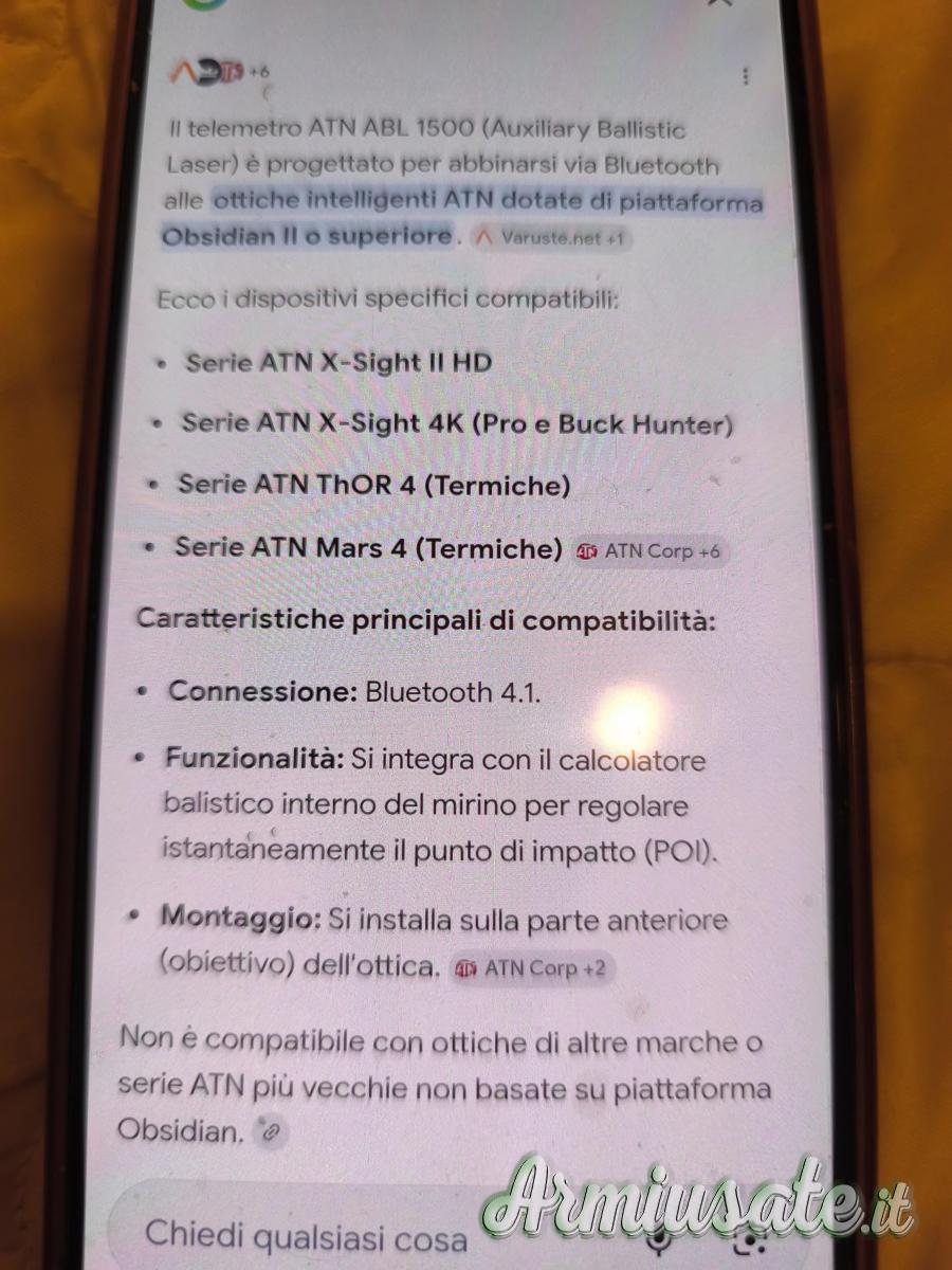 Non ha la campana di alluminio ingombrante fornita dall'ATN perche' non e' pratica ed e' difficile da montare. L'apparecchio e' stato equipaggiato con un supporto acquistato in Gran Bretagna 120 euro con attacco a sgancio rapido in modo di applicare o togliere il telemetro in un secondo.