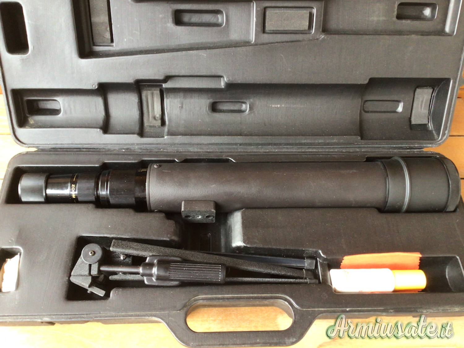 Completo di case rigido per il trasporto e del suo treppiede.
