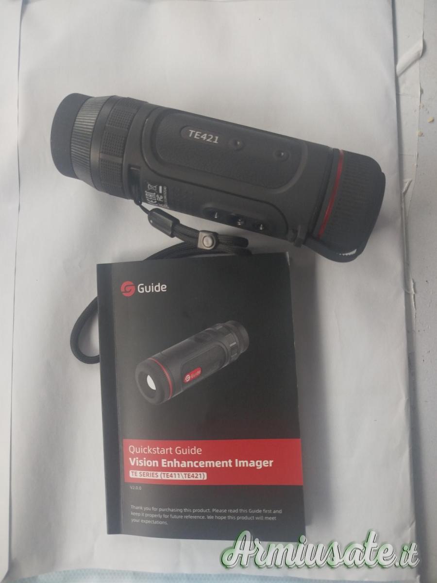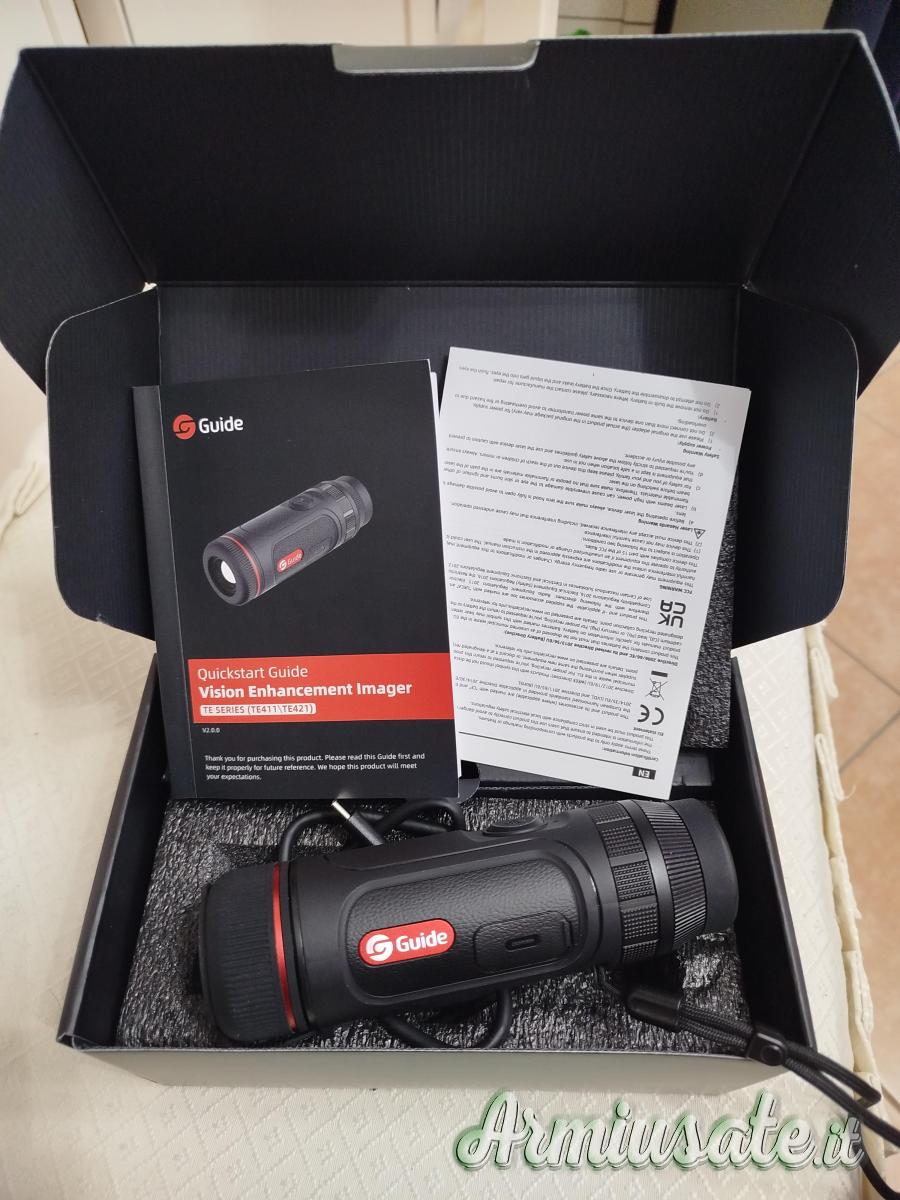 GUIDE TE421 è un monoculare termico Wi-Fi compatto con sensore VOx 400×300, zoom ottico 7.6x e portata di 1300 m. Registra audio, autonomia 6 h, ricarica rapida e app.Completo di scatola originale e tutti gli accessori originali in dotazione.