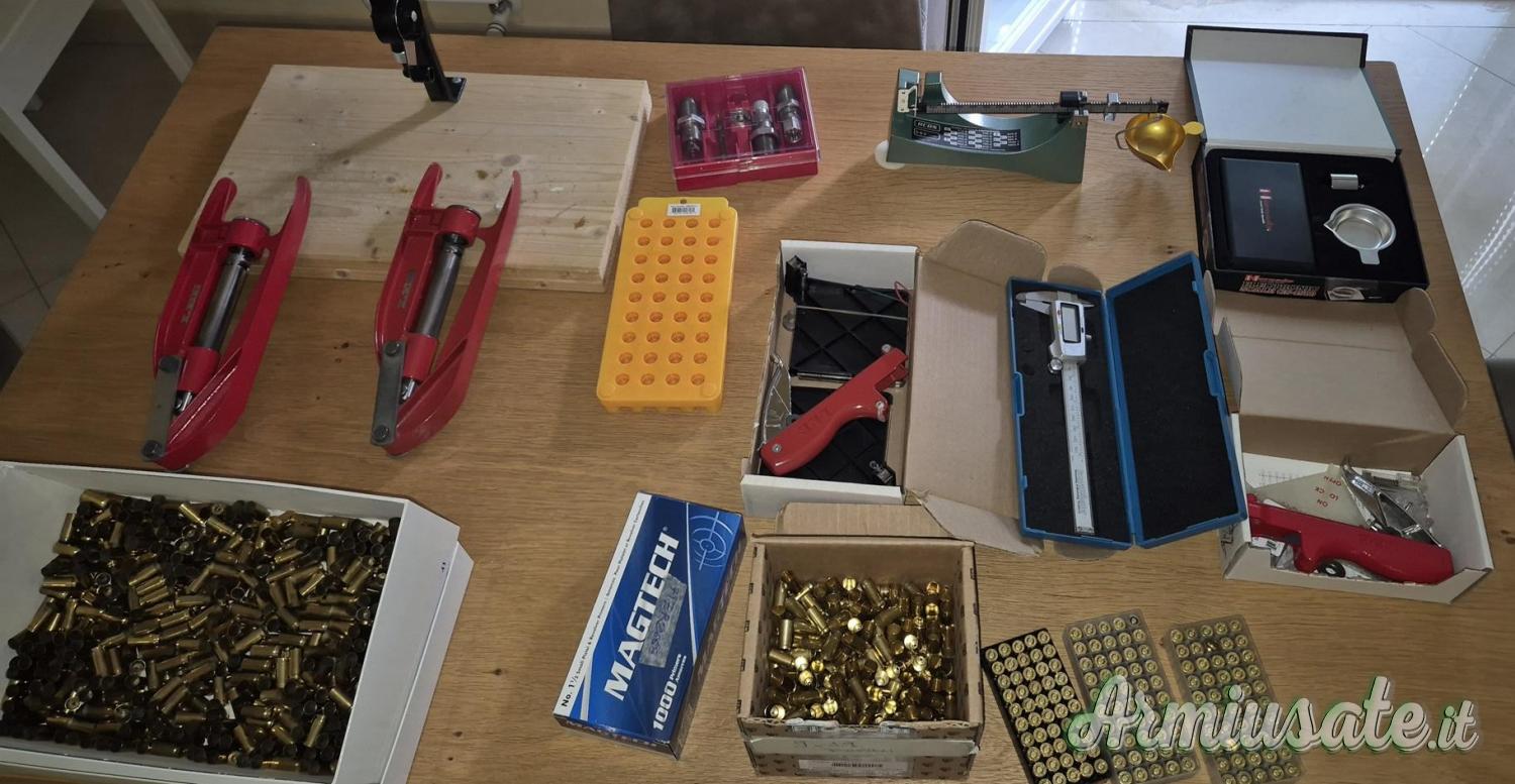 dies Lee, 2 presse manuali lee , dosatore a colonna, 2 innescatori per primer, bilancia RCBS 505 meccanica, + BILANCIA ELETTRONICA, 1,9 kg bossoli 1° sparo 9x21, 1,9 kg bossoli primo sparo 9x19 , 150 bossoli 9x19 già innescati. 900 primer small mag tech , ed altri accessori come da foto vendesi unicamente in blocco.