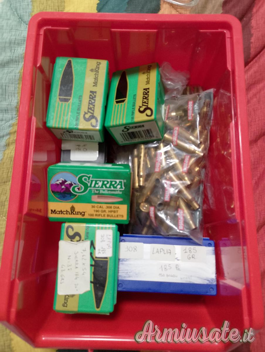 Cedo: palle 308 185 grs Lapua 190 PZ. Palle 308 190grs Sierra 100 Pz. Palle 311 174 grs Sierra 340Pz. Bossoli 7,62x54 : 60 Norma ( +40 pronti) più altri 60 Ppu e Sellier misti ,tutti innescati Federal match. 250 tutto. Volendo e consegnando a mano circa 7 etti di N 135(80 euro).