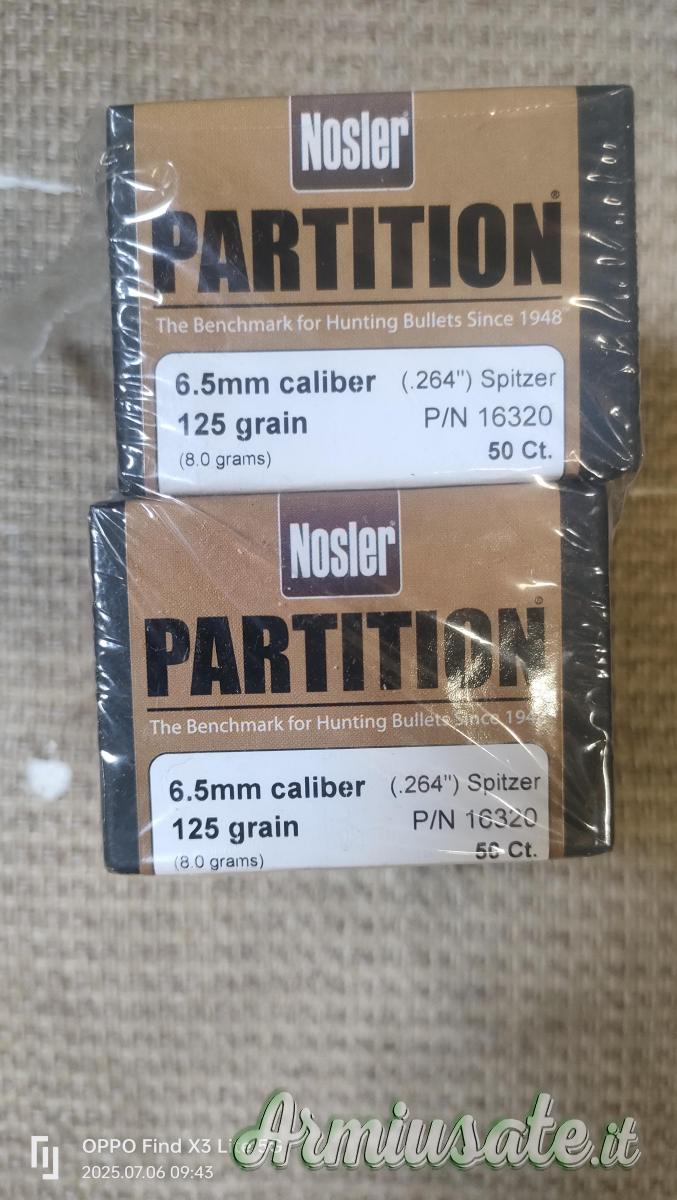 Cedo n. 2 confezioni di proiettili cal. 6,5 marca Nosler tipo Partition da 125 gr. Attualmente sono universalmente riconosciuti come i milgiori proiettili da caccia con prestazioni simili alle ogive tipo match. Sui siti di vendita on line sono praticamente introvabili. Considerando a quanto vengono proposte, vendo ad euro 150, 00 compreso spedizione. Prezzo non trattabile.