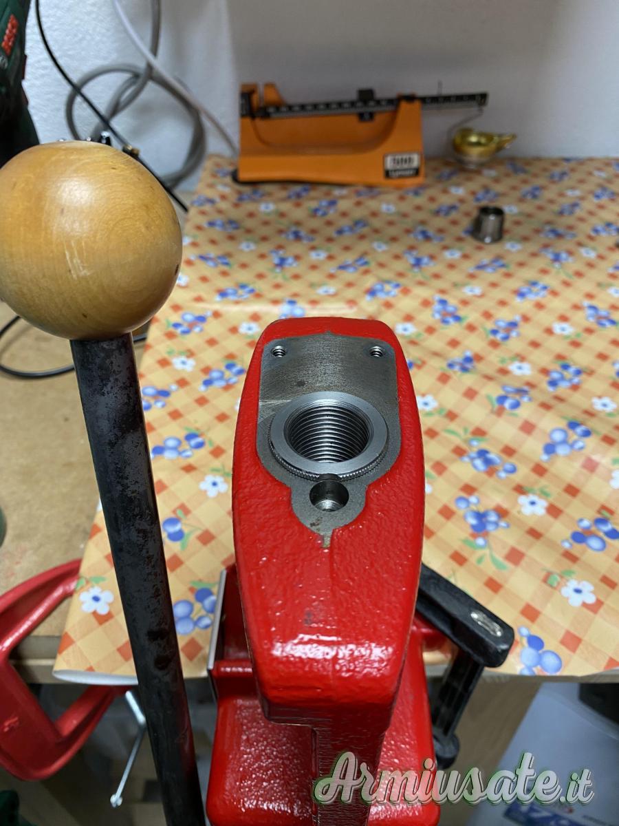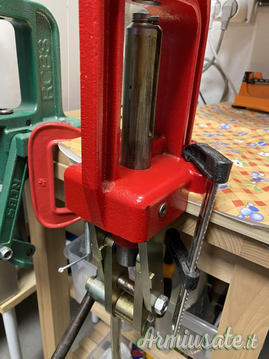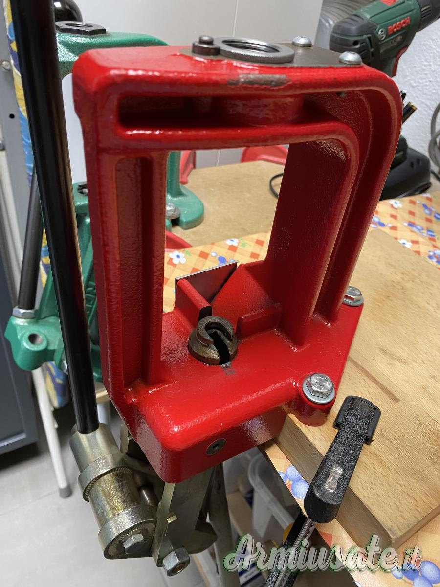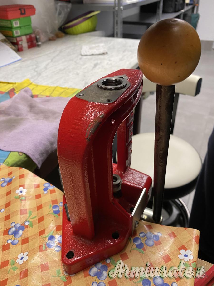 pressa monostazione con ben 12 boccole adattatrici per inserimento rapido dies senza rifare misurazioni cambiando calibri. Le presse in foto sono due, ad una manca un pomellino sblocca dies, si può ordinare ma non è indispensabile PREZZO PER SINGOLA PRESSA