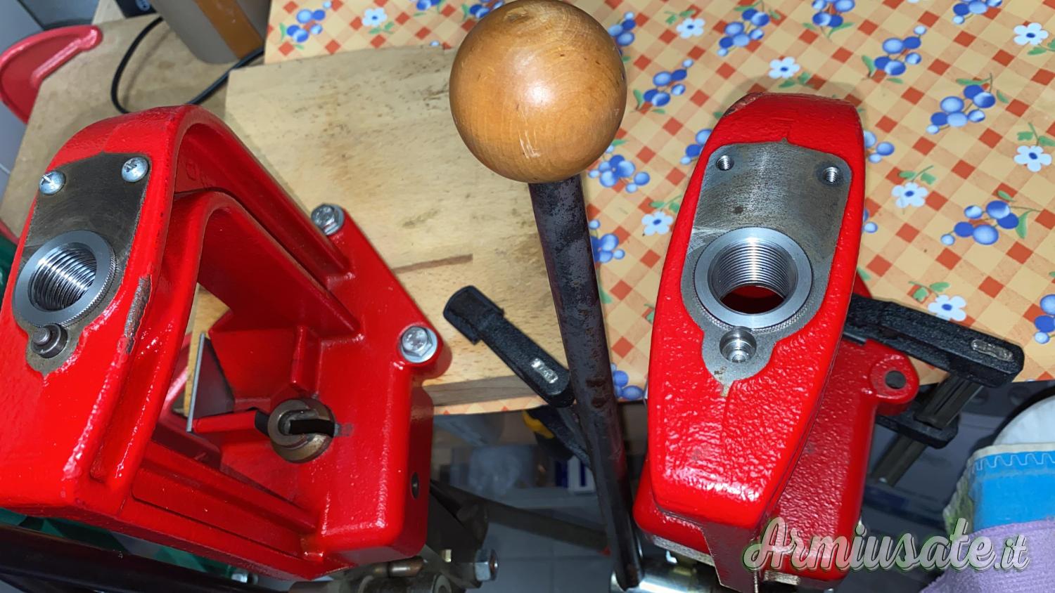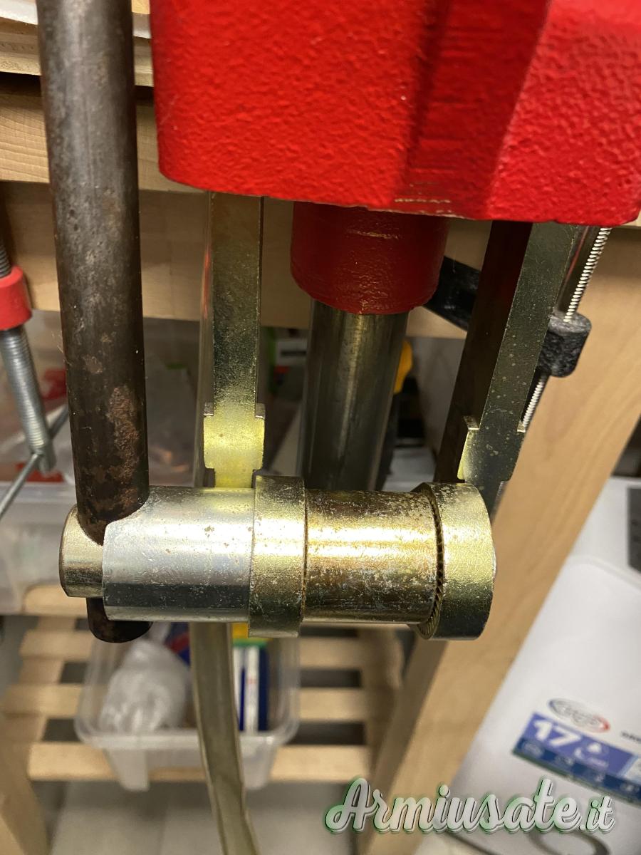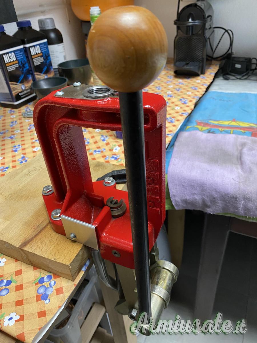 pressa monostazione con ben 12 boccole adattatrici per inserimento rapido dies senza rifare misurazioni cambiando calibri. Le presse in foto sono due, ad una manca un pomellino sblocca dies, si può ordinare ma non è indispensabile PREZZO PER SINGOLA PRESSA