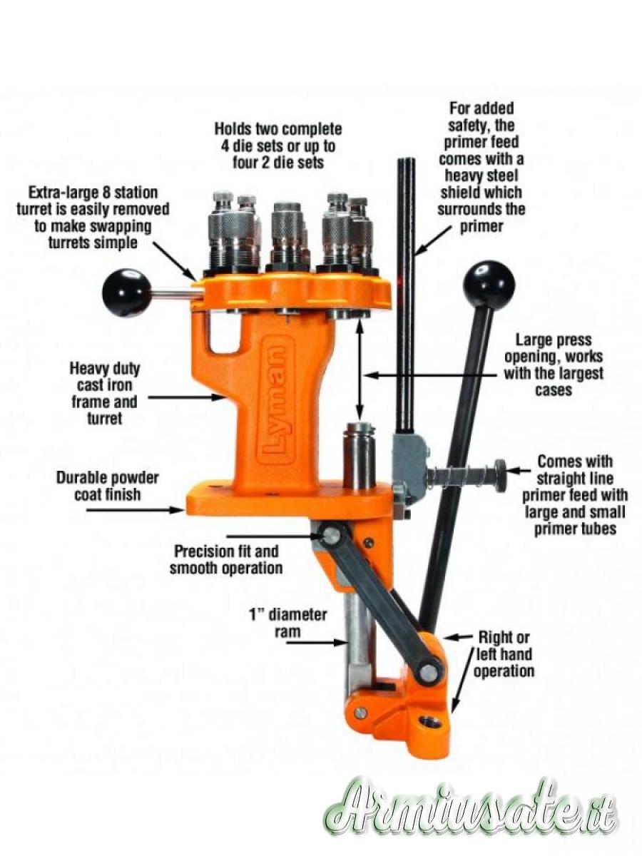 La pressa Brass Smith All-American 8 è dotata di una comoda impugnatura a sfera che può essere posizionata per l'uso con la mano destra o sinistra. La pressa Brass Smith All-American 8 è progettata per l'uso con qualsiasi filettatura standard da 7/8"x14 e accetta supporti standard.
