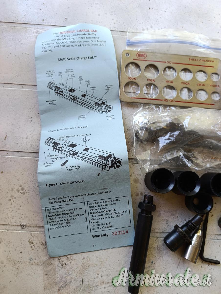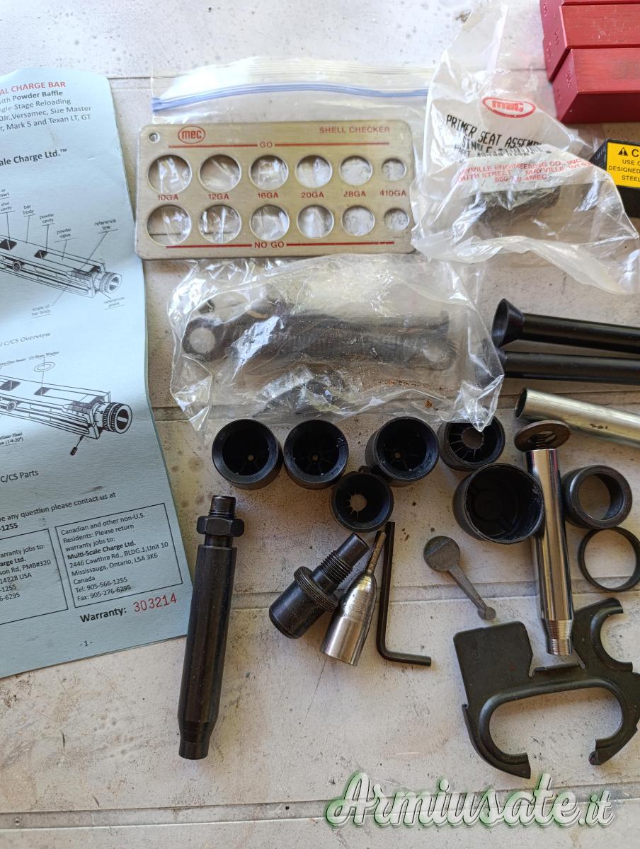 Pressa per caricamento cartucce uso venatorio ecc. compresa di barra micrometrica più tutti gli accessori per i vari calibri con serbatoio Polvere e Piombo.